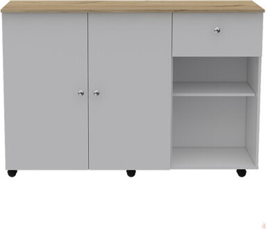 - Home & Living > Furniture > Latitude Run Kitchen Island Cart Victoria, Four Interior Shelves, Six Carters, One Drawer, Double Door Cabinet -White / Light Oak Bar Carts & Bar Furniture