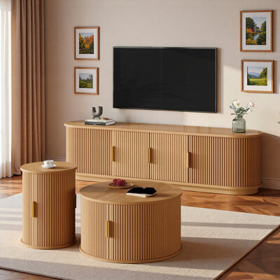 | Characteristics of goods | The door panels decorated with vertical wooden strips wrap around the cabinet body, adding a touch of retro and natural charm to the entire combination. In the middle are two stainless steel hinge doors that open and close smoothly. Open the cabinet door. The TV cabinet can accommodate up to 75-inch TVS, creating an immersive home viewing experience for you. The storage cabinets on both sides are equipped with sliding doors, which are convenient to operate and both practical and aesthetically pleasing. This two-piece entertainment center combination, with its multi-functional design, meets the various needs of family entertainment, leisure and storage. Mercer41 Color: Natural Made of MDF material and paired with a wood grain surface, it not only showcases the warm texture of natural wood but also features excellent durability. The interior of the coffee table is ingeniously divided into eight compartments. The four carefully designed cable management holes on the rear panel allow the cables of the TV and peripheral devices to be organized in an orderly manner, saying goodbye to disorder. The side table is equipped with two layers of storage racks, providing convenient storage space for frequently used items and achieving a perfect combination of aesthetics and practicality. The design of the safety rounded corners is thoughtful and comprehensive, effectively preventing collision injuries in daily life and providing reliable protection for family members, especially children. The four adjustable storage racks inside can be flexibly adjusted in layout according to actual needs to store various items. Whether it's daily magazines, remote controls, or small decorations, you can all find a suitable storage place. The coffee table set includes a coffee table and a side table. The golden metal handle is exquisite and dazzling, not only enhancing the texture of the product but also making operation more convenient. Details: This entertainment center set includes an oval TV stand and a round coffee table set. The round tabletop design gives the space a soft and elegant feel. | ||