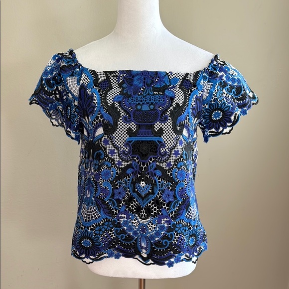 Alice + Olivia Guipure Off Shoulder Crochet Embroidery Blouse Top Lace Blue Sz S Blouses