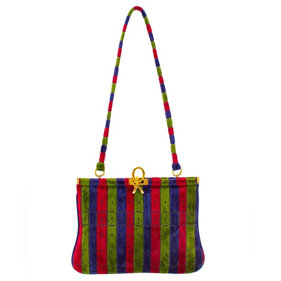 | Characteristics of goods | Item is vintage and it is in EUCGorgeous Roberta Di Camerino bag from the 1970s. Stripes also feature a trompe-l'ลil illusion of watch bands. Removable corresponding velvet stripe strap. Gold tone hardware with a large R detail at kiss lock closure. Made in Italy. Excellent vintage condition. Vertical stripes in the iconic Roberta Di Camerino jewel tone colours of red, green, and navy blue.BID RESPONSIBLY NO CANCELLATIONS REFER TO THE FOTOS FOR A BETTER DESCRIPTION OF THE ITEM Black leather interior with single horizontal slit pocket with gold tone zipper and gold brand stamping. | ||