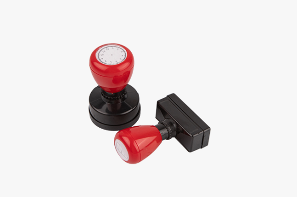 - Pre-inked rubber stamps with a rectangular shape